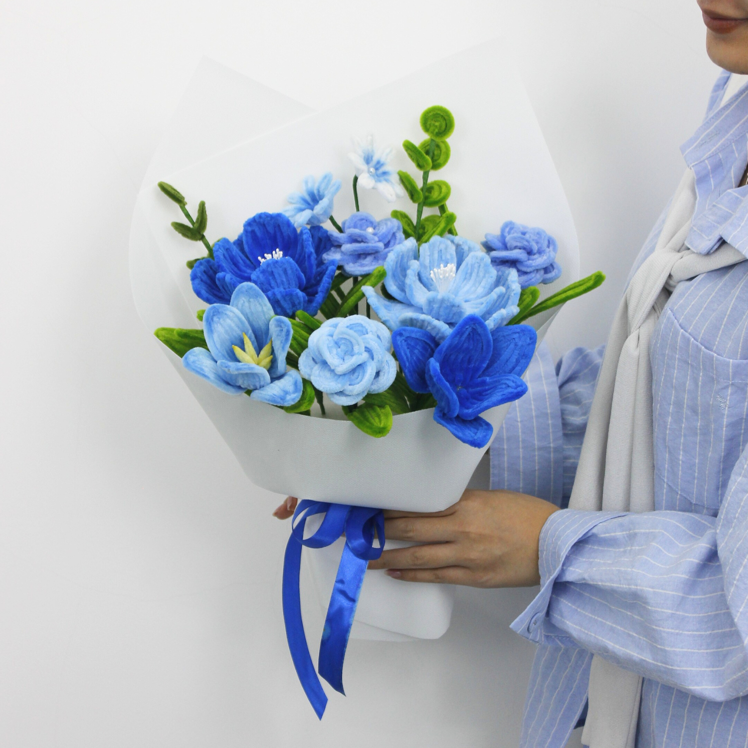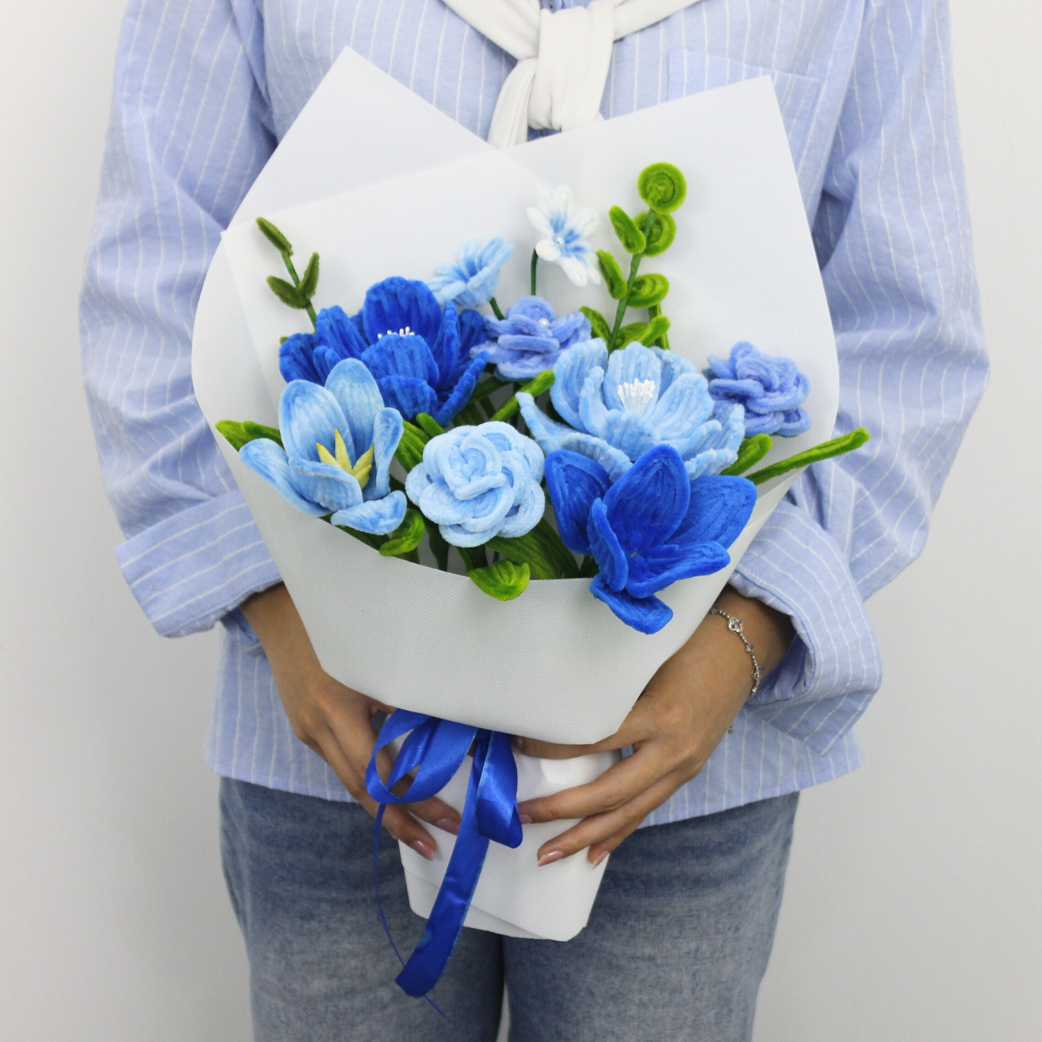 A serene symphony of winter hues, the Blue Neige Bouquet combines lifelike peonies, roses, and tulips in soft blue tones. Each bloom is meticulously shaped using heat-press techniques, capturing natural petal details for a refined, realistic finish. Elegant, calming, and quietly captivating.